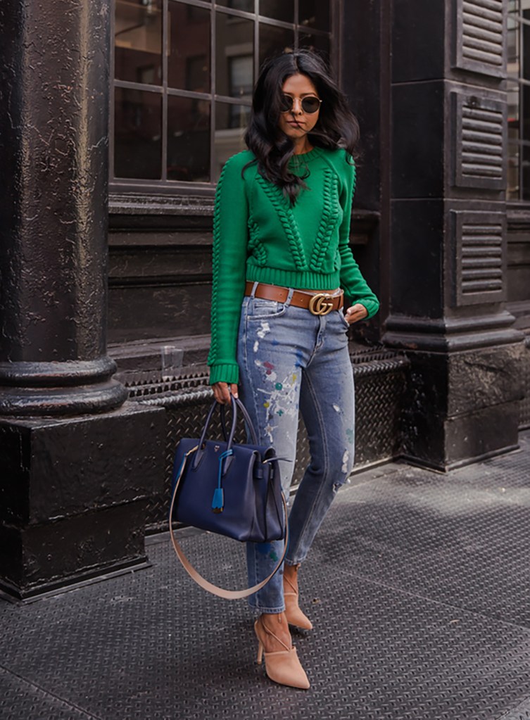 If you are feeling more bold, emerald green can be your March go-to! I love how this outfit incorporates cute jeans and a stylish nude heel. Statement belts are also very popular right now, any neutral color belt will go great with emerald green. If you are looking for a balanced and trendy outfit, reference the picture above for inspiration!