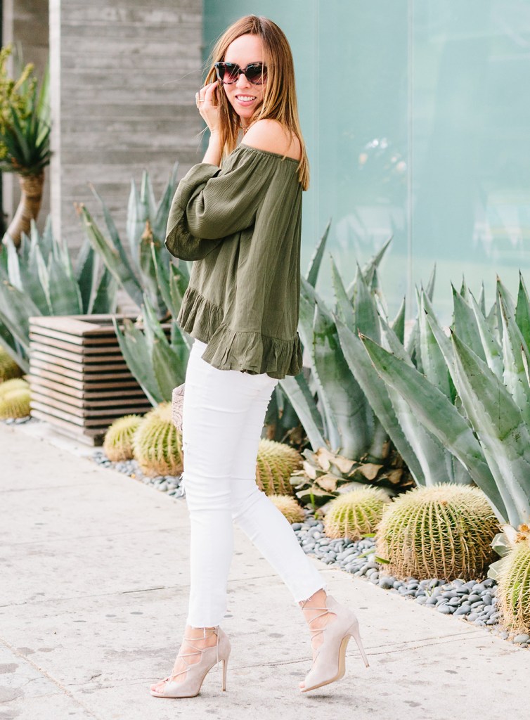 Personally, army green is a favorite color of mine to wear. Like this look above you can rock your stylish army green top and even welcome in the spring weather with white denim for a nice spring look! If you are going to work, brunch, or just running errands you can still look festive with an outfit like this.
